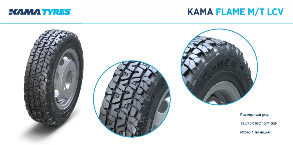 Шина KAMA FLAME M/T LCV предназначена для применения на легкогрузовых автомобилях повышенной проходимости 4x4 при соблюдении скоростной и нагрузочной характеристик, соответствующих данной шине, на дорогах всех категорий в том числе вне дорог с твердым покрытием (грязь, песок, рыхлый снег), в климатических зонах при температуре окружающей среды от минус 45 до плюс 55 градусов C. Шины радиальной конструкции, бескамерные, с рисунком протектора повышенной проходимости.